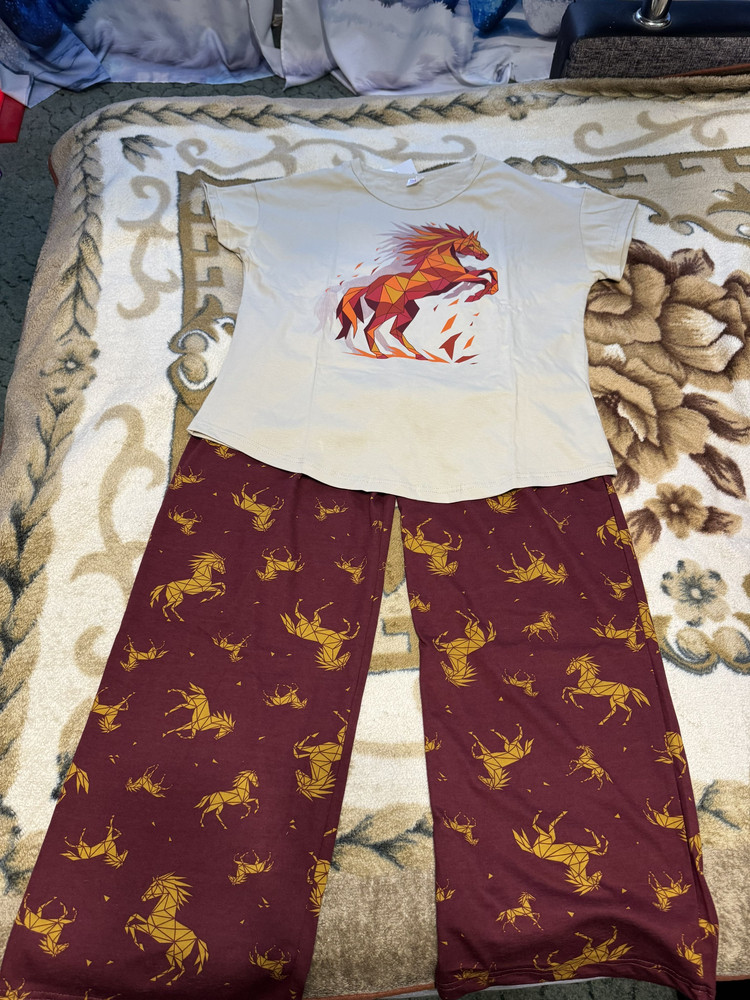 Штаны выполнены из трикотажа с набивным рисунком лошадей, который создаёт выразительный праздничный образ. Фасон — широкий, свободный, идеально подходящий для сна и домашних дел. В боковых швах находятся удобные карманы, добавляющие практичности. Особое внимание привлекает широкий простроченный пояс, мягко фиксирующий посадку и не вызывающий дискомфорта.